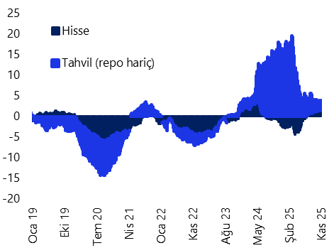 Yabancı yatırımcılar, 14 – 21 Kasım haftasında hisse senedi piyasasında 71,9 milyon dolar, tahvil piyasasında ise (repo işlemleri hariç) 239,1 milyon dolar tutarında net alım gerçekleştirdi. Böylelikle tahvil piyasasındaki yabancı girişi üst üste dördüncü haftada da devam ederken, dört haftalık kümülatif yabancı alımı 1,4 milyar dolara ulaştı. 14 – 21 Kasım haftasında yabancı yatırımcının tahvil stoku içerisindeki payı ise %6,8’den %6,9’a çıktı. Son bir sene içerisindeki kümülatif veriye baktığımızda; hisse senedi piyasasında 1,6 milyar dolar, tahvil piyasasında ise (repo işlemleri hariç) 2,3 milyar dolarlık yabancı girişi görülüyor. Yılbaşından bu yana bakıldığında ise yabancı yatırımcıların hisse senedi piyasasındaki pozisyonları 1,4 milyar dolar, bono piyasasında ise repo işlemleri hariç toplam 2 milyar dolarlık net girişe işaret ediyor.