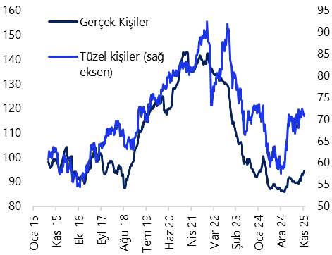 Bu dönemde, yurt içi yerleşiklerin altın hariç parite etkisinden arındırılmış DTH’ları 575 milyon dolar düşüş kaydetti. Verinin detayını hesapladığımızda; kurumların DTH’larının 292 milyon dolar, hanehalkı DTH’larının ise 283 milyon dolar gerilediği görmekteyiz. Aynı hafta içerisinde yerleşiklerin kıymetli maden hesaplarında 335 milyon dolarlık artış yaşanırken; hanehalkı kıymetli maden hesaplarının 511 milyon dolar arttığı, kurumlar hesaplarının ise 176 milyon dolar azaldığı takip edildi. Özetle, 14 – 21 Kasım haftasında yerleşiklerin altın dahil toplam DTH hesapları, fiyat etkisinden arındırılmış olarak 241 milyon dolar geriledi.