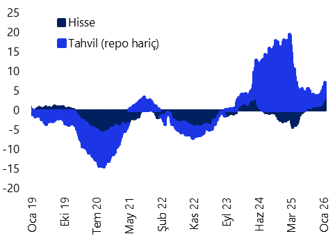 Yabancı yatırımcılar, 16 – 23 Ocak haftasında hisse senedi piyasasında 490,6 milyon dolar, tahvil piyasasında ise repo işlemleri hariç 1,26 milyar dolarlık net alım gerçekleştirdi. Yabancı yatırımcının toplam bono stoku içerisindeki payı bu dönemde %8 seviyesinden %8,6’ya çıkarak Ocak 2025’ten bu yana en yüksek seviyeye ulaştı. Böylelikle hisse senedi piyasasındaki yabancı girişi üst üste sekizinci haftaya ulaşırken, bu yedi haftalık periyotta kümülatif yabancı alımı 1,8 milyar doları aştı. Bono piyasasında ise özellikle ekim sonundan bu yana istikrarlı bir yabancı girişi olduğu ve girişlerin belirginleştiği 31 Ekim haftasından bu yana bonodaki kümülatif yabancı girişinin 5,8 milyar dolara ulaştığı izleniyor.