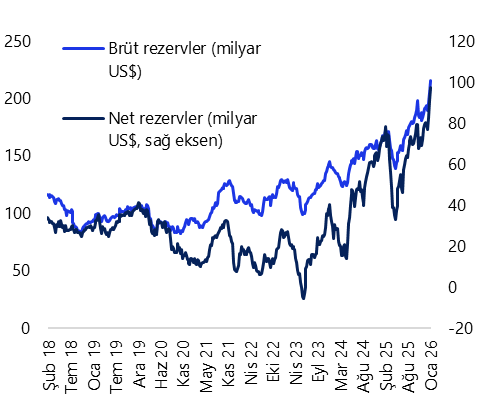 16 – 23 Ocak haftasında TCMB net döviz rezervi 6,3 milyar dolar artarak 97,2 milyar dolara çıkarken, brüt döviz rezervi ise 10,5 milyar dolar yükselişle 215,7 milyar dolara tırmanarak rekor tazeledi. Aynı dönemde swap stoku 337 milyon dolar gerileyerek 11,9 milyar dolara inerken, swap hariç net rezerv ise 6,7 milyar dolar artışla 85,3 milyar dolara ulaştı.
