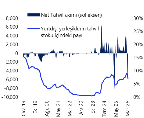 Yabancı yatırımcılar 20 – 27 Mart haftasında hisse senedi piyasasında 137,1 milyon dolar net alım gerçekleştirirken, tahvil piyasasında repo işlemleri hariç 1,4 milyar dolar net satış yaptı. ABD – İran savaşının başladığı 27 Şubat – 6 Mart haftasından bu yana hisse piyasasında üst üste üç hafta net satış yapan yabancıların, bu dönemde sınırlı da olsa yeniden alıma geçtiği görülüyor. Diğer yandan tahvil piyasasında yabancı çıkışı üst üste altıncı haftada da devam ederken, bu dönemde kümülatif çıkış (repo hariç) 7,3 milyar dolara ulaştı. 20 – 27 Mart haftasında yabancıların toplam tahvil stoku içindeki payı ise %6,7’den %6,1’e geriledi. Son bir yıllık kümülatif veriler, hisse senedi piyasasında 3,7 milyar dolarlık net yabancı alımına, tahvil piyasasında repo işlemleri hariç 697 milyon dolarlık sınırlı bir girişe işaret ediyor. Yılbaşından bu yana bakıldığında ise yabancı yatırımcıların hisse senedi piyasasında 1,3 milyar dolar net alım yaptığı, tahvil piyasasında ise repo hariç toplam 1,5 milyar dolarlık çıkışın gerçekleştiği görülüyor.