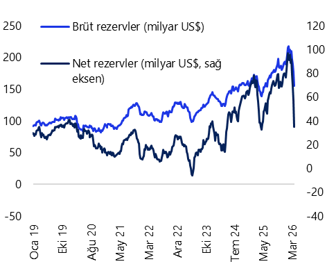 20 – 27 Mart haftasında TCMB brüt döviz rezervi 22,1 milyar dolar azalarak 155,4 milyar dolara, net döviz rezervi ise 22,3 milyar dolar düşüşle 35 milyar dolara indi. Brüt döviz rezervleri içindeki altın varlığı ise 116,2 milyar dolardan 100 milyar dolara geriledi. Bu dönemde swap stoku 479 milyon dolar artarak 14,9 milyar dolar olurken, swap hariç net rezerv ise 22,8 milyar dolar gerileyerek 20,1 milyar dolara indi.
