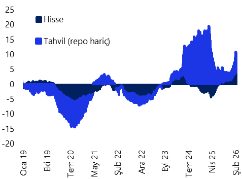 Yabancı yatırımcılar 20 – 27 Şubat haftasında hisse senedi piyasasında 65,3 milyon dolarlık sınırlı bir alım gerçekleştirirken, tahvil piyasasında repo işlemleri hariç 212,8 milyon dolarlık net satış yaptı. Böylece tahvil piyasasındaki yabancı çıkışı ikinci haftaya taşınırken, yabancı yatırımcıların toplam bono stoku içindeki payı %9 seviyesinden %8,9’a geriledi. Hisse senedi piyasasında ise yabancı girişleri üst üste on üçüncü haftaya ulaşsa da, son haftada giriş hızının yavaşladığı dikkat çekiyor. Söz konusu on üç haftalık dönemde hisse senedi piyasasına yönelik kümülatif yabancı alımı 3,2 milyar dolara ulaştı. Yılbaşından bu yana bakıldığında ise hisse senedi piyasasında 2,4 milyar dolar, bono piyasasında ise repo işlemleri hariç 4,6 milyar dolar net yabancı girişi gerçekleşti. ABD – İran geriliminin etkisiyle gelişmekte olan ülke piyasalarına yönelik risk iştahında zayıflama görülüyor. Bununla birlikte yakın dönemde portföy akımları kanalıyla yabancı çıkışlarının yaşanabileceğini değerlendiriyoruz.