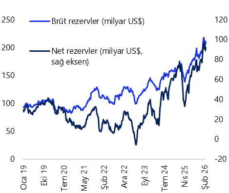 20 – 27 Şubat haftasında TCMB net döviz rezervi 2,6 milyar dolar artarak 91,6 milyar dolara, brüt döviz rezervi ise 4,2 milyar dolar yükselişle 210,4 milyar dolara çıktı. Aynı dönemde swap stoku 638 milyon dolar düşüşle 12,9 milyar dolara inerken, swap hariç net rezerv ise 3,2 milyar dolar artarak 78,7 milyar dolar oldu. Analitik bilanço üzerinden yaptığımız hesaplamalar, TCMB’nin döviz satışları çerçevesinde brüt döviz rezervinin bu hafta başından bu yana yaklaşık 9,4 milyar dolar azaldığına, net döviz pozisyonunun ise 13,6 milyar dolar gerilediğine işaret ediyor. Bu çerçevede gelecek hafta açıklanacak rezerv verilerinde belirgin bir düşüş görmeyi bekliyoruz.