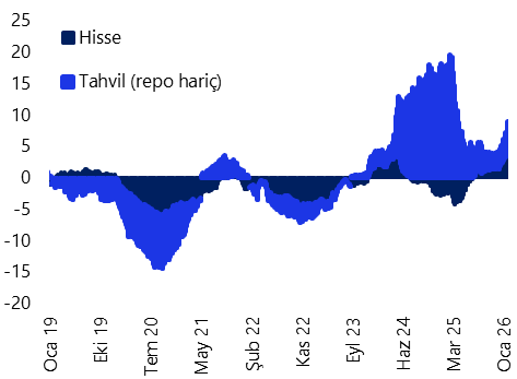 Yabancı yatırımcılar, 23 – 30 Ocak haftasında hisse senedi piyasasında 455 milyon dolar, tahvil piyasasında ise repo işlemleri hariç 721,8 milyon dolarlık net alım gerçekleştirdi. Yabancı yatırımcının toplam bono stoku içerisindeki payı ise bu dönemde %8,6’dan %8,9’a çıkarak Şubat 2020’den bu yana en yüksek seviyeye ulaştı. Böylelikle hisse senedi piyasasındaki yabancı girişi üst üste dokuzuncu haftaya ulaşırken, bu dokuz haftalık periyotta kümülatif yabancı alımı 2,9 milyar dolar oldu. Bono piyasasında ise özellikle ekim sonundan bu yana istikrarlı bir yabancı girişi olduğu ve girişlerin belirginleştiği 31 Ekim haftasından bu yana bonodaki kümülatif yabancı girişinin 6,5 milyar dolara ulaştığı izleniyor.