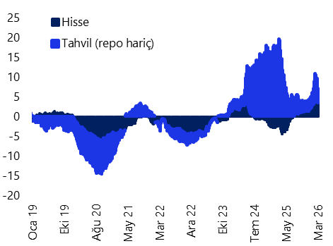 Yabancı yatırımcılar 27 Şubat – 6 Mart haftasında hisse senedi piyasasında 755,6 milyon dolar, tahvil piyasasında ise repo işlemleri hariç 1,7 milyar dolar net satış gerçekleştirdi. Böylelikle tahvil piyasasında yabancı çıkışı üst üste üçüncü haftada da devam ederken, yabancı yatırımcıların toplam tahvil stoku içerisindeki payı %8,9’dan %8,1’e geriledi. Hisse senedi piyasasında ise on üç hafta süren yabancı girişinin ardından, geçtiğimiz hafta itibarıyla net yabancı çıkışı görülüyor. ABD–İran geriliminin etkisiyle gelişmekte olan ülke piyasalarına yönelik risk iştahında zayıflama dikkat çekerken, yakın dönemde yabancı yatırımcıların portföy akımlarında zayıf bir seyrin etkili olabileceğini değerlendiriyoruz.