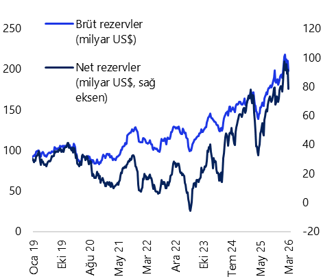 ABD – İran geriliminin ardından geçtiğimiz hafta rezervlerde belirgin bir düşüş yaşandı. 27 Şubat – 6 Mart haftasında TCMB net döviz rezervi 13 milyar dolar düşüşle 78,6 milyar dolara, brüt döviz rezervi ise 12,8 milyar dolar azalarak 197,6 milyar dolara indi. Aynı dönemde swap stoku 821 milyon dolar yükselerek 13,8 milyar dolara çıkarken, swap hariç net rezerv ise 13,8 milyar dolar düşüşle 64,9 milyar dolar oldu.