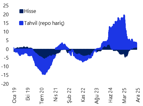 Yabancı yatırımcılar, 28 Kasım – 5 Aralık haftasında hisse senedi piyasasında 154,3 milyon dolar alım yaparken, tahvil piyasasında ise repo işlemleri hariç 23,7 milyon dolarlık sınırlı bir satış gerçekleştirdi. Böylelikle tahvil piyasasında üst üste beş haftadır devam eden yabancı alım serisi kesintiye uğradı. Hatırlanacağı üzere yabancı yatırımcılar kasım ayı boyunca repo hariç tahvil piyasasında toplam 2 milyar dolarlık alım yapmış, bu dönemde yabancıların tahvil stoku içindeki payı mart ayından bu yana ilk kez %7 eşiğini aşmıştı. Aralık ayına tahvil tarafında sınırlı bir yabancı satışıyla başlanmış olsa da, önümüzdeki dönemde yabancı talebinin devam edip etmeyeceği, faiz patikasına ilişkin algı ve standart portföy kanallarına yönelik talep açısından belirleyici olacak. Yılbaşından bu yana bakıldığında ise yabancı yatırımcıların hisse senedi piyasasındaki pozisyonları 1,6 milyar dolar, bono piyasasında ise repo işlemleri hariç toplam 2,6 milyar dolarlık net girişe işaret ediyor.
