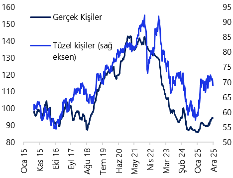 Bu dönemde, yurt içi yerleşiklerin altın hariç parite etkisinden arındırılmış DTH’ları, kurumların satışı öncülüğünde 2,6 milyar dolarlık sert bir düşüş kaydetti. Verinin detayını hesapladığımızda; kurumların DTH’larının 2,3 milyar dolar, hanehalkı DTH’larının ise 324 milyon dolar gerilediği görmekteyiz. Aynı hafta içerisinde yerleşiklerin kıymetli maden hesaplarında ise 545 milyon dolarlık artış yaşanırken; hanehalkı kıymetli maden hesaplarının 446 milyon dolar, kurumlar hesaplarının ise 99 milyon dolar arttığı takip edildi. Özetle, 28 Kasım – 5 Aralık haftasında yerleşiklerin altın dahil toplam DTH hesapları, fiyat etkisinden arındırılmış olarak 2 milyon dolar geriledi.