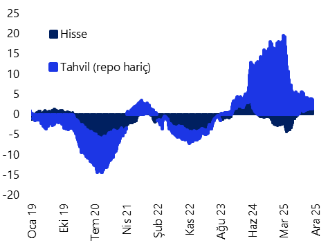 Yabancı yatırımcılar, 5 – 12 Aralık haftasında hisse senedi piyasasında 26,3 milyon dolarlık sınırlı alım yaparken, tahvil piyasasında repo işlemleri hariç 339,6 milyon dolar tutarında güçlü bir giriş gerçekleştirdi. Bu dönemde yabancıların tahvil stoku içindeki payı %7,3 seviyesinde yatay seyretti. Yılbaşından bu yana bakıldığında, yabancı yatırımcıların hisse senedi piyasasında 1,6 milyar dolar, repo işlemleri hariç tahvil piyasasında ise toplam 2,9 milyar dolarlık net alım yaptığı görülüyor. Kasım ayı boyunca tahvil piyasasında repo hariç 2 milyar dolar tutarında alım yapan yabancıların, geçen haftaki 23,7 milyon dolarlık sınırlı satışın ardından tahvil tarafındaki alımlarına yeniden hız verdiği izleniyor. Önümüzdeki dönemde yabancı yatırımcı talebinin seyri, faiz patikasına ilişkin algı ve standart portföy kanallarına yönelik ilginin gücü açısından belirleyici olmaya devam edecek.