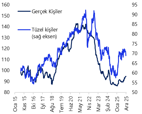 Bu dönemde, yurt içi yerleşiklerin altın hariç parite etkisinden arındırılmış DTH’ları, kurumların alımları öncülüğünde 202 milyon dolar yükseliş kaydetti. Verinin detayını hesapladığımızda kurumların DTH’larının 362 milyon dolar arttığını, hanehalkı DTH’larının ise 160 milyon dolar gerilediği görmekteyiz. Aynı hafta içerisinde yerleşiklerin kıymetli maden hesaplarında ise 400 milyon dolarlık artış yaşanırken; söz konusu artışın 336 milyon doları hanehalkı kıymetli maden hesaplarındaki yükselişten kaynaklı. Özetle, 5 – 12 Aralık haftasında yerleşiklerin altın dahil toplam DTH hesapları, fiyat etkisinden arındırılmış olarak 602 milyon dolar arttı.