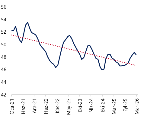 İstanbul Sanayi Odası (İSO) Türkiye İmalat PMI, mart ayında 49,3’ten 47,9’a gerileyerek ekimden bu yana en düşük düzeyine indi. Böylelikle PMI’ın 50 eşik değerinin altında seyretmesine bağlı olarak, imalat sanayi sektöründeki kesintisiz yavaşlama eğilimi iki yıla ulaştı. Hatırlanacağı üzere PMI, şubatta 48,1’den 49,3’e yükselerek son 22 ayın en yüksek seviyesine ulaşmıştı. Bununla birlikte, 2026 yılının ilk çeyreğinde PMI ortalama 48,4 seviyesinde gerçekleşti. Bir önceki çeyrek ortalaması 47,8 düzeyindeydi. Bu görünüm, özellikle şubat ayındaki güçlü artışın etkisiyle ilk çeyrekte daralmanın hız kestiğine işaret etse de, ABD – İran savaşının başlamasıyla birlikte mart ayında daralmanın yeniden belirginleştiğini ortaya koyuyor.