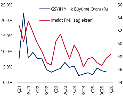 ABD – İran savaşının ekonomik faaliyet üzerindeki olumsuz etkileri nedeniyle, 2026 yılına ilişkin %4 seviyesindeki büyüme tahminimiz üzerinde belirgin aşağı yönlü riskler oluşmuş durumda. TCMB’nin efektif 300 baz puanlık faiz artırımı sonrasında faiz indirimlerinin bu yıl daha gecikmeli ve sınırlı ilerleyeceği beklentimizle, 2026 sonunda büyümenin %3,4 civarında gerçekleşebileceğini düşünüyoruz. Arz şokunun süresi ve gelişmekte olan ülke piyasalarından çıkışların büyüklüğüne bağlı olarak büyüme üzerindeki aşağı yönlü risklerin daha da belirginleşmesi mümkün.