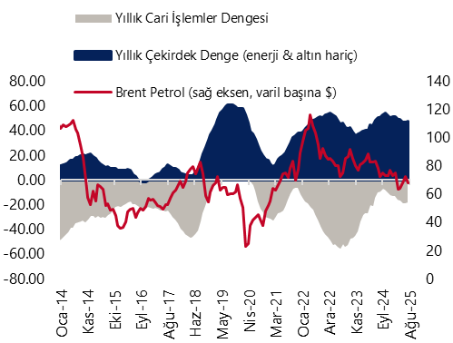Öncü veriler çerçevesinde cari işlemler dengesinin eylül ayında 2,1 milyar dolar fazla vereceğini tahmin ediyoruz. Eylül ayında ödemeler dengesi tanımlı dış ticaret açığının 2,8 milyar dolardan 4,4 milyar dolara yükselmesini, seyahat kaleminden kaynaklanan net gelirin azalması ile birlikte hizmetler dengesi fazlasının ise 9,5 milyar dolardan 7,6 milyar dolara inmesini bekliyoruz. 2025 yıl sonu cari açık tahminimiz 22 milyar dolar (GSYİH’nın %1,5’i) seviyesinde bulunmakla birlikte, tahminimizi yönelik risklerin aşağı yönlü olduğunu değerlendiriyoruz.