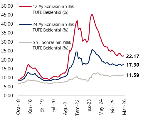 Piyasa katılımcıları Para Politikası Kurulu’nun (PPK) 22 Nisan’da gerçekleşecek toplantısında politika faizinin 60 baz puan indirimle %36,4 seviyesinde oluşmasını bekliyor. Katılımcılar, 11 Haziran tarihli PPK toplantısında ise politika faizini %35,3 seviyesinde öngörüyor. 2026 yıl sonu politika faizi beklentisi ise %29 seviyesinden %30,6’ya yükselmiş durumda. Anket katılımının çarşamba günü sona ermiş olması nedeniyle, dün gerçekleşen PPK toplantısının anket sonuçlarına yansımamış olduğunu hatırlatmak isteriz. Mart toplantısında kurum beklentimize paralel olarak faizlerde değişikliğe gitmeyen PPK’nın, üst banttan fonlamaya (%40) bir süre daha devam etmesi beklenebilir. Bununla birlikte, son dönemde artan jeopolitik gerilimin süresi ve enerji fiyatları üzerindeki etkilerine ilişkin belirsizlikler, para politikasında gevşeme alanını sınırlıyor. Risklerin artması halinde TCMB’nin ilave sıkılaştırıcı adımlar atabileceğini göz ardı etmiyoruz. Mevcut belirsizliklerin azalması halinde ise önce kademeli olarak haftalık repo ihalelerine dönülmesiyle piyasa faizlerinin politika faizine (%37) yakınsaması, ardından kademeli faiz indirimlerinin devam etmesi beklenebilir. Yıl sonu politika faizi beklentimiz, yukarı yönlü riskler barındırarak, %29,5 seviyesinde bulunuyor.