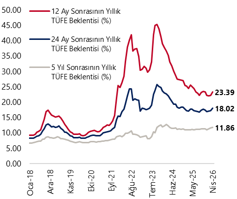 TCMB’nin Nisan 2026 dönemine ilişkin Piyasa Katılımcıları Anketi yayımlandı. Katılımcıların 2026 yıl sonu TÜFE beklentisi %25,4’ten %27,5’e, 2027 yıl sonu beklentisi ise %18,7’den %20,1’e yükseldi. 12 ay sonrasına ilişkin TÜFE beklentisi %22,2’den %23,4’e çıkarken, 24 ay sonrasına ilişkin beklenti %17,3’ten %18’e, 5 yıl sonrasına ilişkin beklenti ise %11,6’dan %11,9’a yükseldi.