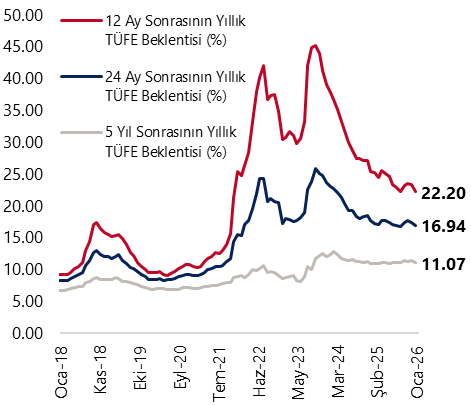Katılımcıların aylık TÜFE artışı beklentileri ocak için %3,8, şubat için ise %2,05 seviyesinde oluştu. Aralık ayı anketinde ocak ayına ilişkin aylık TÜFE beklentisi %3,44 seviyesindeydi. Kurum olarak ocak ayı aylık TÜFE artışının %4’ün üzerinde gerçekleşmesini bekliyoruz. Şu ana kadar derlediğimiz fiyat verileri, ocak ayı aylık TÜFE artışını yaklaşık %4,13 seviyesine işaret ediyor. Ay sonuna kadar bu tahminimiz şekillenmeye devam edecek olmakla birlikte, %4’ün üzerinde bir ocak enflasyonu beklentimiz büyük ölçüyle netleşmiş durumda. 2026 yıl sonu TÜFE tahminimiz %23 seviyesinde bulunurken, çekirdek göstergelerdeki sınırlı iyileşme, hizmet enflasyonundaki katılık ve gıda fiyatlarındaki oynaklık nedeniyle tahminimize yönelik risklerin yukarı yönlü olduğunu değerlendiriyoruz. Ocak ayında yıllık TÜFE’nin %30’un bir miktar altına inmesinin ardından, haziran ayına kadar ancak %27 seviyelerine doğru sınırlı bir aşağı yönlü alan bulunuyor. Yıl sonu tahminimiz olan %23’e doğru belirgin gerilemenin ise yılın ikinci yarısında gerçekleşmesini bekliyoruz. Bu çerçeve, 2026 genelinde dezenflasyonun daha yavaş bir patika izleyeceğine işaret ediyor.