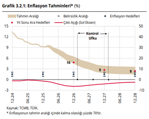 TCMB Başkanı Fatih Karahan tarafından gerçekleştirilen 2026 – 1. Çeyrek Enflasyon Raporu sunumunda 2026 yıl sonu tahmin aralığı %13 - %19 bandından %15 - %21 bandına revize edilirken, %16 seviyesinde olan ara hedef ise korundu. 2027 sonu için enflasyon tahmin aralığı %6 - %12 bandında belirlenirken, ara hedef %9 seviyesinde sabit bırakıldı. 2028 yılı için ise ara hedef %8 seviyesinde belirlendi.